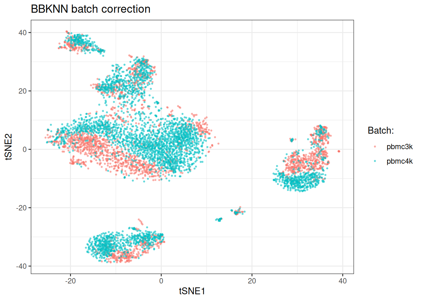 BBKNN is useful when you want to avoid modifying the embedding at all. The batch-balanced graph can be passed directly to graph-based clustering algorithms. It is the lightest-touch approach but provides less control over the degree of correction.