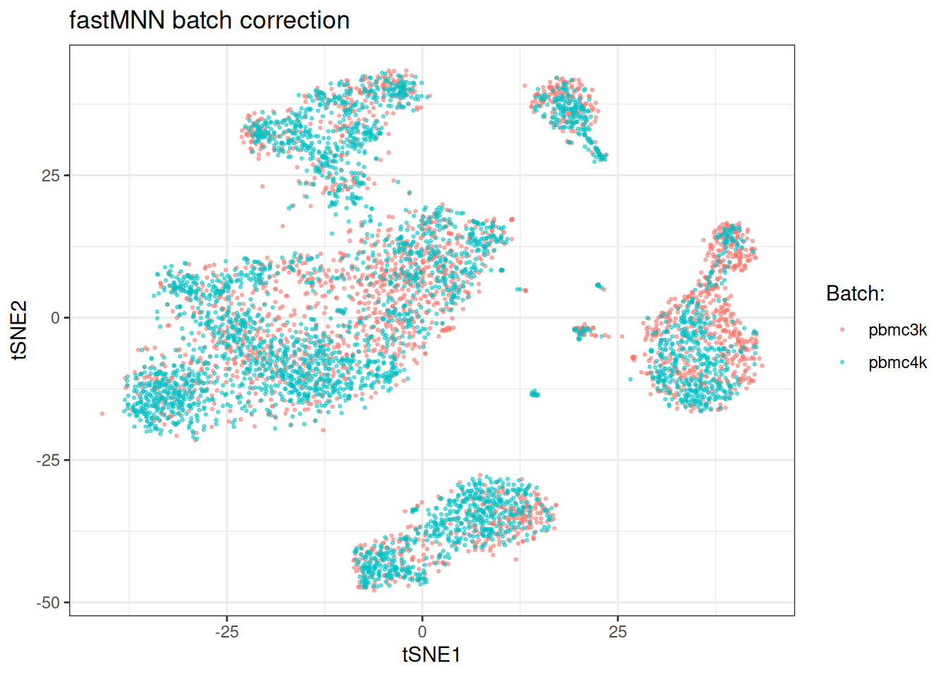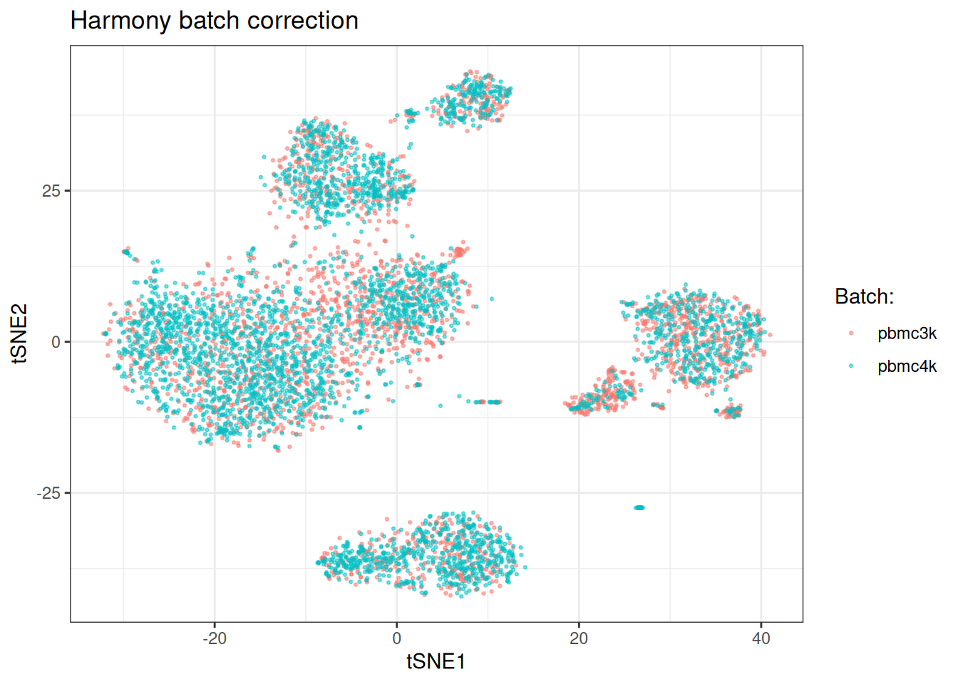 )[, batch := sc_object[["sample"]]]tSNE plot (tSNE’s usually look prettier… It’s anyway not a good way to assess batch effect correction, so at least let’s make it pleasant on the eye).