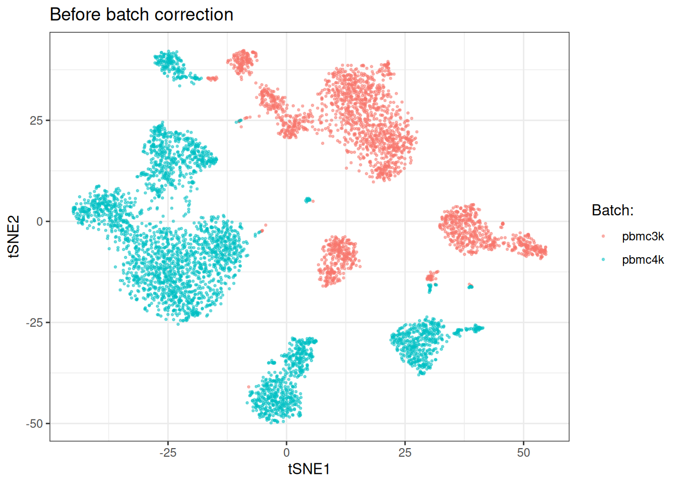 #> Median LISI: 1.0000The high kBET rejection rate and mean chi-square well above the expected value of 1 confirm a substantial batch effect. LISI scores also indicate very poor batch matching and the tSNE shows clear separation by batch.