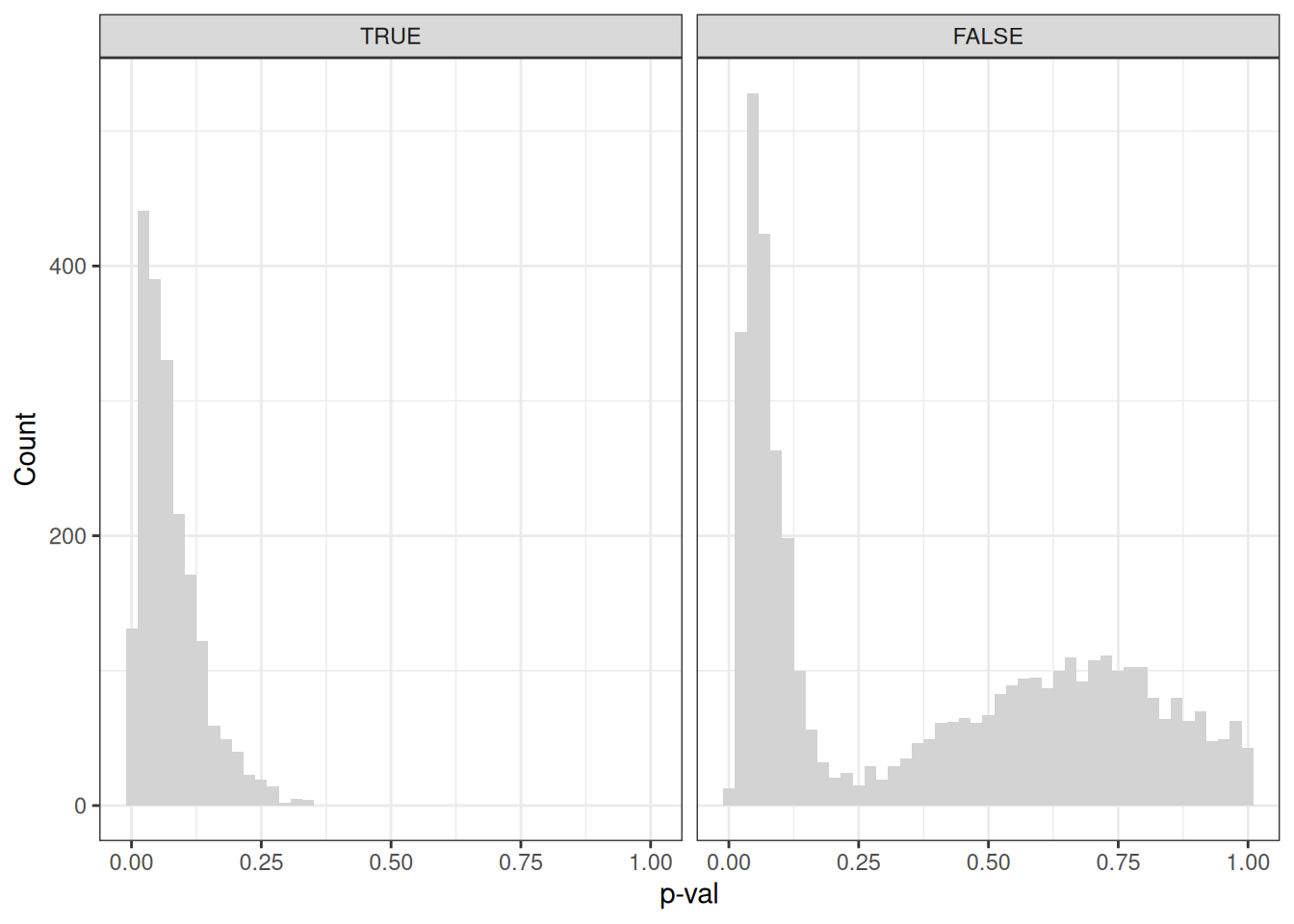 As we can appreciate, the Cosine similarities between the genes and pathways in the signal data set are all much higher compared to the FALSE ones, and we have a bimodal distribution for the noise genes. Some of these just by accident get connected into the same dense communities from the signal genes, but a large number of them are just noise. Let’s check the p-values